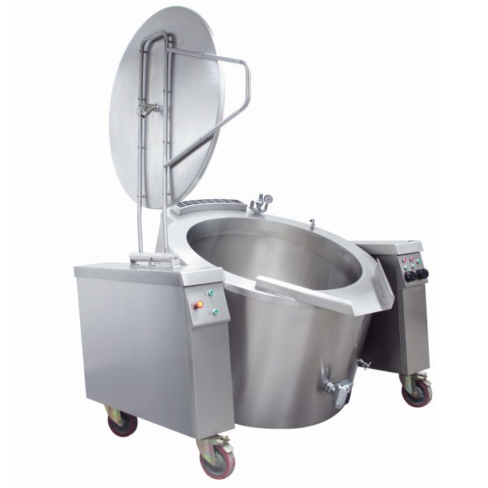 - Elektrický varný kotel s automatickým sklápěcím systémem, regulace na ovládacím panelu.