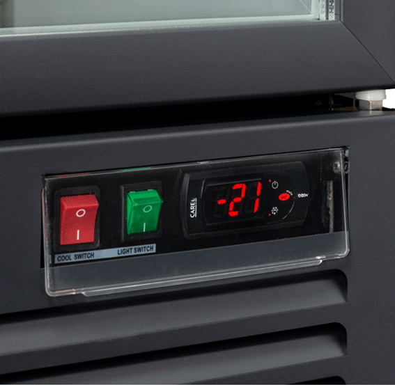 - Vyhřívané dveře s antikondenzačním trojitým bezpečnostním sklem a argonovou výplní, vnější hliníková hranatá rukojeť, automatické zavírání.