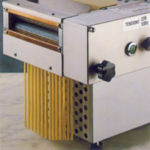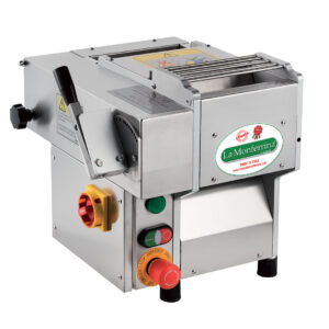 - Profesionální stolní stroj na výrobu válcovaných dlouhých těstovin s regulací tloušťky těstového plátu.