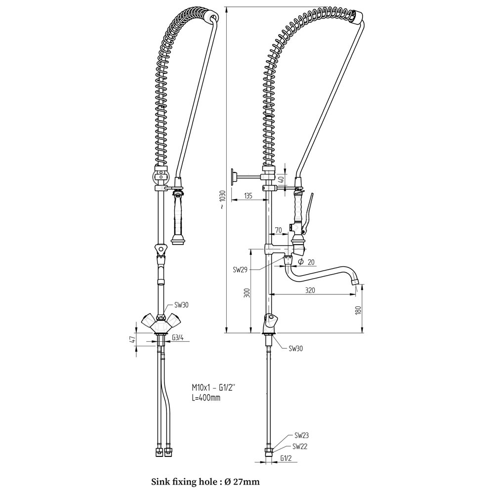 Schwenkhahn, Durchfluss: 18 Liter/Minute. Einloch 3/4″ (Ø 29 mm). Wandbefestigung 135 mm. Schlauchlänge 1000 mm. Brausendurchfluss 12 Liter/Minute.