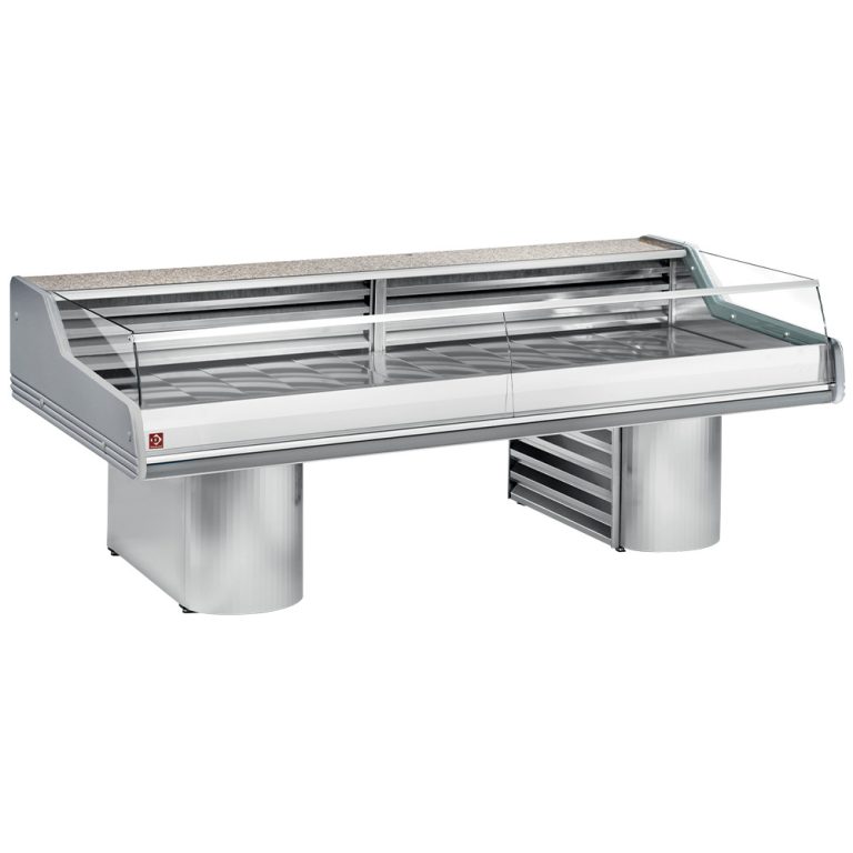 - Ausstellungsfläche aus Edelstahl AISI 316, mit doppeltem, perforiertem Boden und Wasserabfuhr.