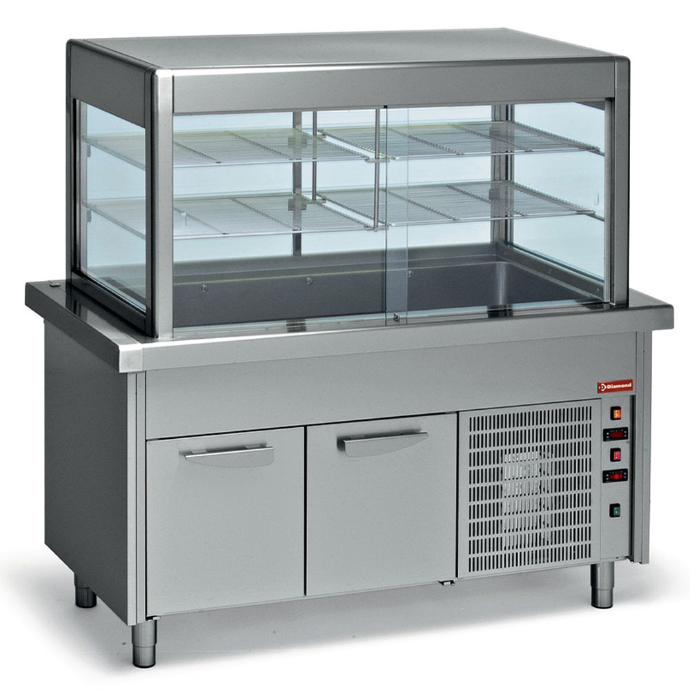 - Vitrine mit 2 Ebenen, Schiebetüren auf der Bediener- und Klapptüren auf der Kundenseite (2×3).