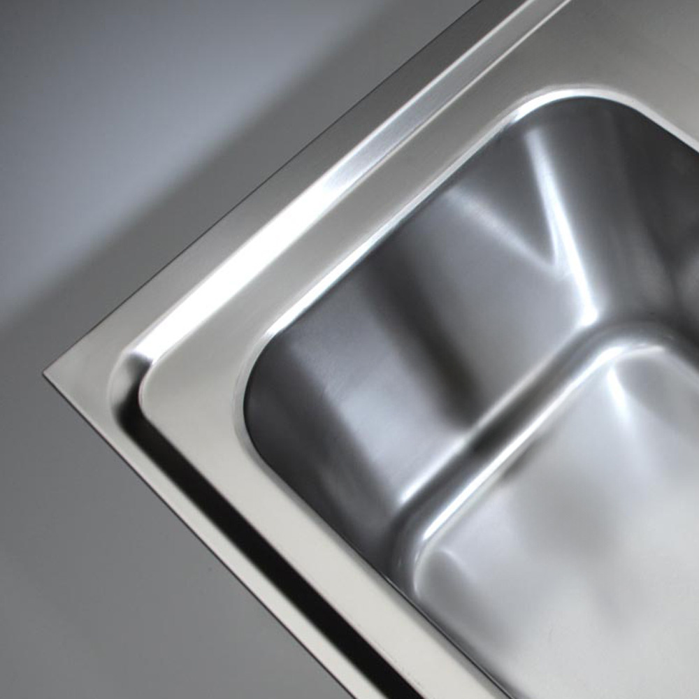 - With 2 compartments, draining board + grid, 2 sink on the left.