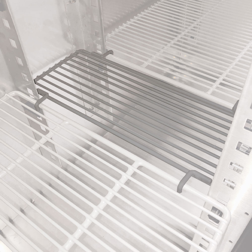 - 2 rilsanized grids (450×430 mm) per door, adjustable, interior storage (standing bottles) 3x 50 cl, 33 cl, ….. free height 737 mm.