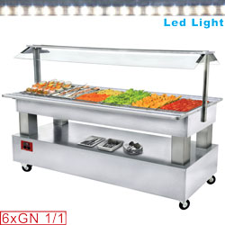- Stainless steel posterns, roof with removable protections (condiments or dishes 190 mm) , anti-breath protection cristal “plexiglas”, at each side, LED lighting.