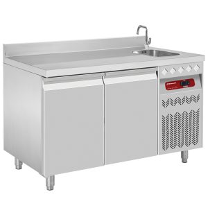 Sink 340x400x200mm integrated in the work top (right side).Delivered with a siphon; drain screen and overflow (NB: tap on request, opening on the work top (27 mm)."Wall" model with back board.1 ventilated evaporator.Included: 1 grid GN 1/1 (530x325 mm), by door.