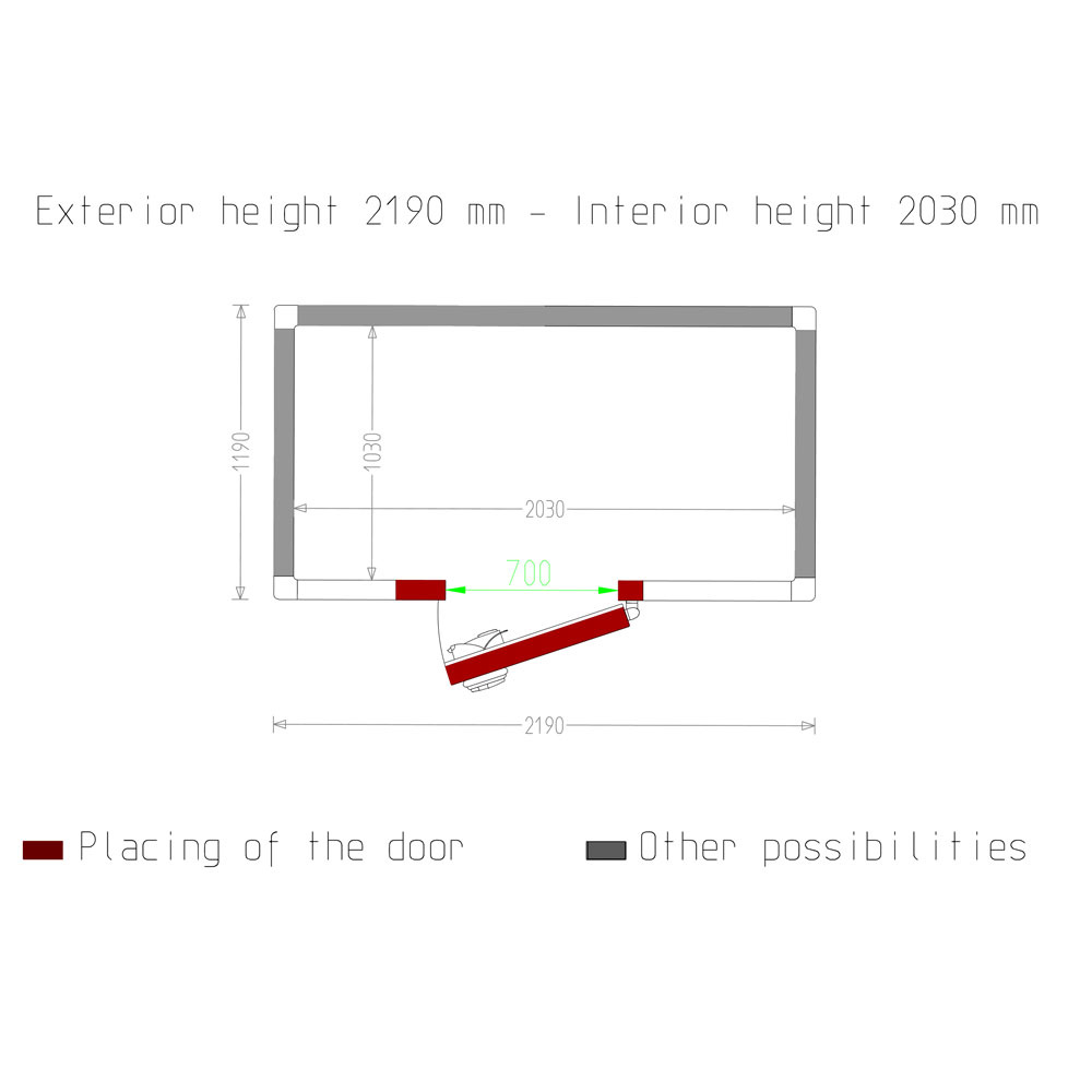 - Door with useful passage 700 x 1900 mm (positioning of the door at choice, on the 4 sides).