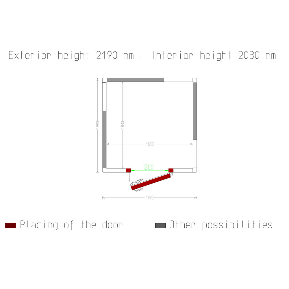 - Door with useful passage 800 x 1900 mm (positioning of the door at choice, on the 4 sides).