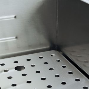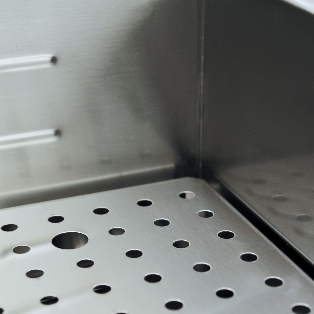 - Basin in stainless steel AISI 304, standard equipped with perforated bottom plate, (bullet) outlet tap is served frontally.