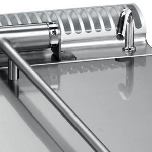 - Upper tablet in 15/10 mm thick AISI 304 stainless steel, front edge with drip stop, deep-drawn, watertight tops, rounded corners on the inside of the tanks, ‘high technology’ quality components.