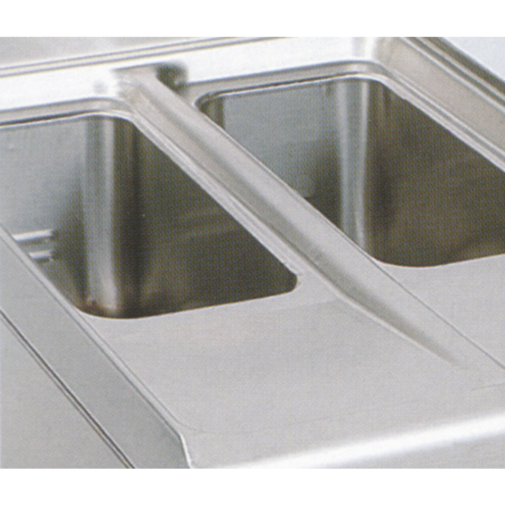 - Upper tablet in 15/10 mm thick AISI 304 stainless steel, front edge with drip stop, deep-drawn, watertight tops, rounded corners on the inside of the tanks, ‘high technology’ quality components.