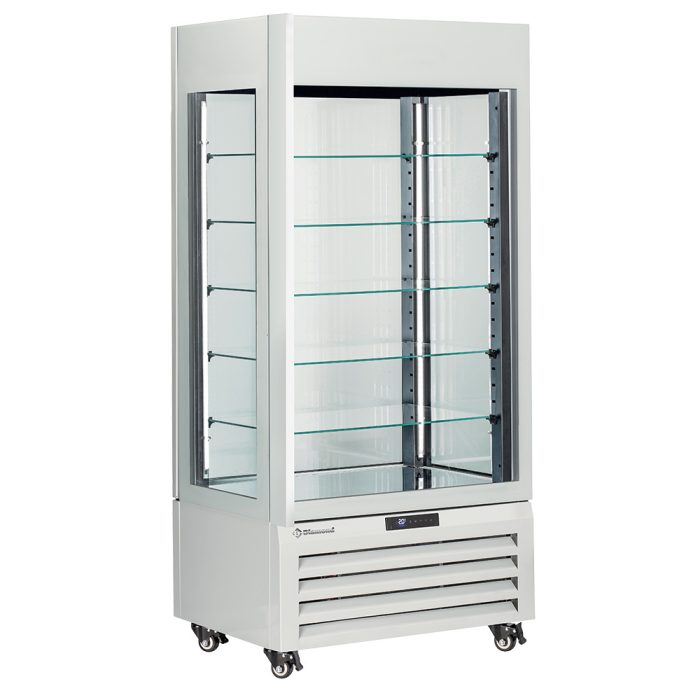 - They feature a large glass display area (EURONORM 400×600 and GASTRONORM 1/1), 4 glass sides, “FULL GLASS” glass door, and LED lighting on each column.