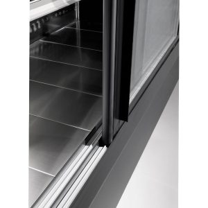 - 3 shelves (290mm) for exposure (in stainless steel), equipped with “price-holder” moulding, adjustable racks and possibility of tilting the brackets (Plexiglas to hold the products in a tilted position included).