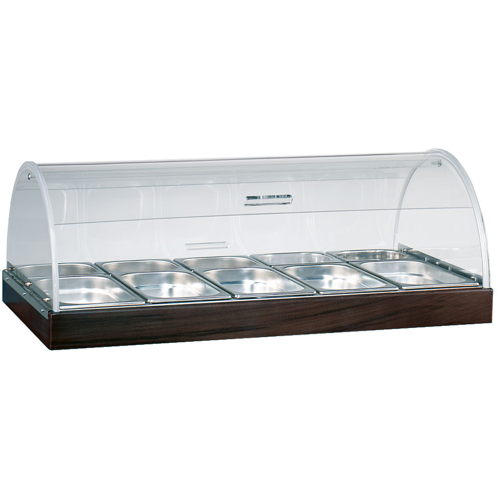 Doska z masívneho dreva, prevedenie wengé. Kupola z plexiskla, otváranie z oboch strán. Kapacita 5 x GN1/3 a 5 x GN 1/6, hĺbka 65 mm.