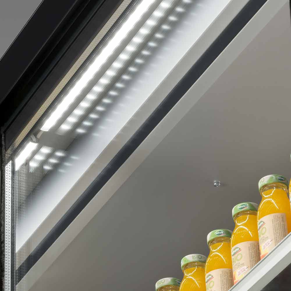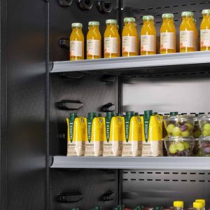 - Samoobslúžny prístenný chladiaci regál s krídlovými presklennými dverami.